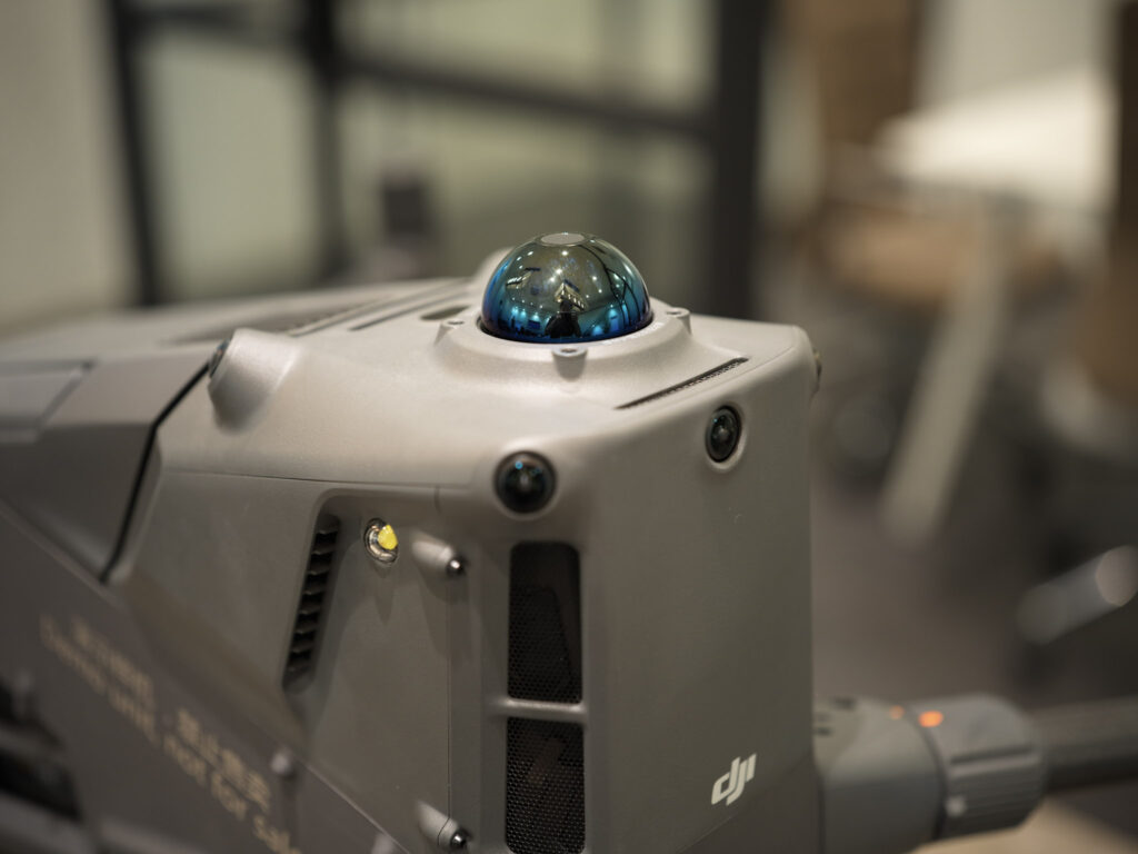機体上部にある半球型のものが、Lidar障害物センサーとなり、水平360度の検知を行います。これにより光のない暗い環境や細かい枝、電線など1.2mm以上の物体などが検出ができます。測定範囲は概ね0.5m~100m、35m先からの電線(21.6mm)の検出ができるスペックとなっています。