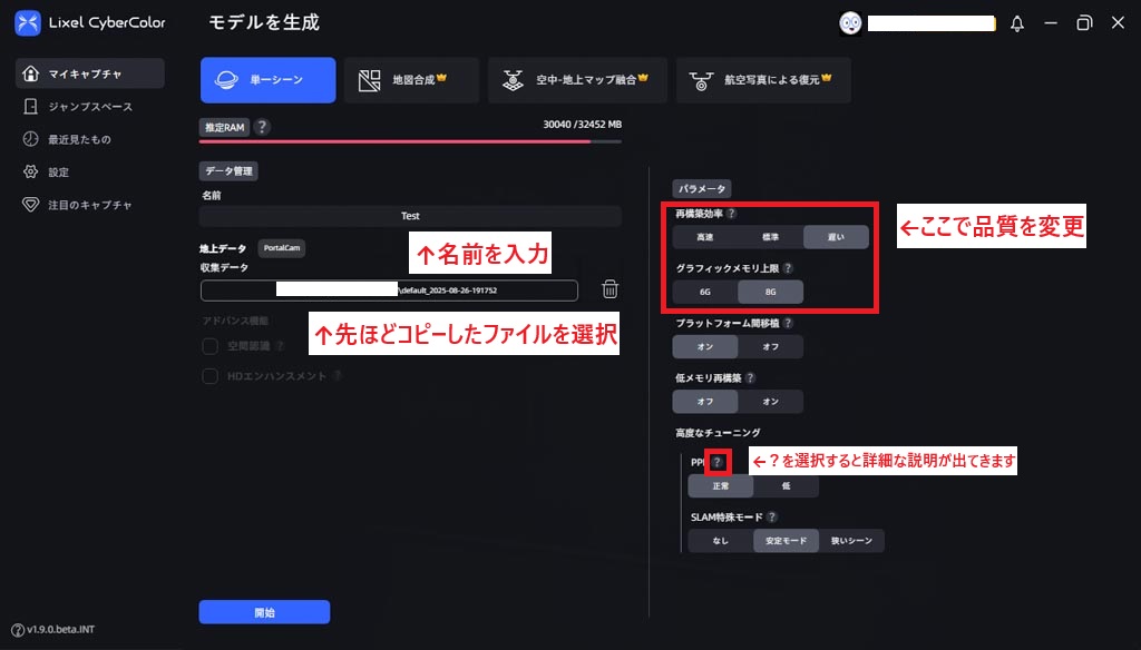 先ほどコピーしたデータのディレクトリを指定し、右側でモデルのクオリティーや詳細な設定を選びます。基本はデフォルトでの出力で問題ありません。