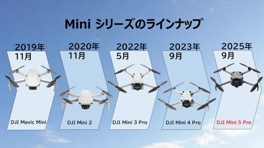 これまで「Miniシリーズ」は、7種類ものモデルが登場してきましたが、今回の Mini 5 Pro の登場により、ついに8機種目となりました。