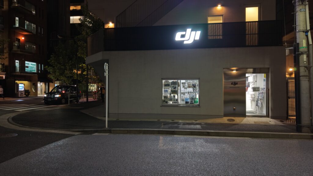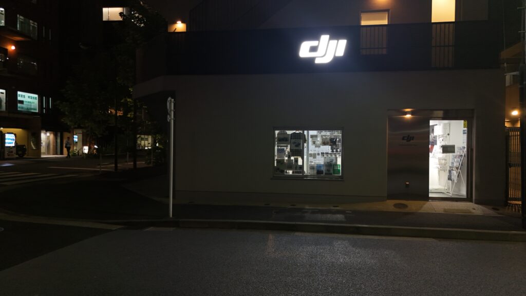 比べてみると Mini 5 Pro の方が全体に明るく撮れていて、細部でも明るく光るDJIの看板が鮮明で、ストア入口の光もノイズが少なく自然な色になっていますよね。