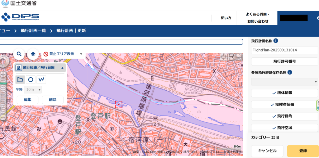 最後に「飛行経路/範囲」と「ページ右側の項目」を入力すると、飛行計画の通報が完了いたします。今回は「DID地区」「夜間飛行」「目視外飛行」「人・家屋から30m未満」の条件を通報しました。
