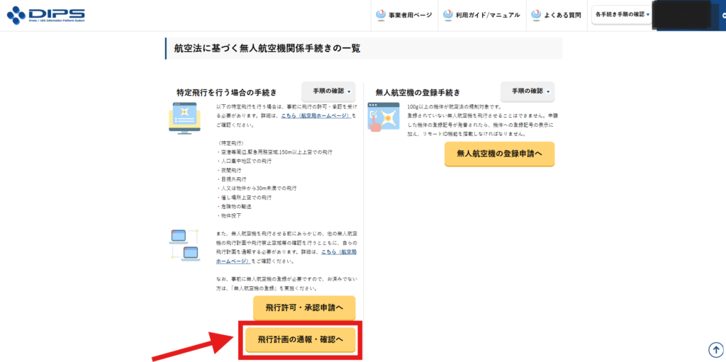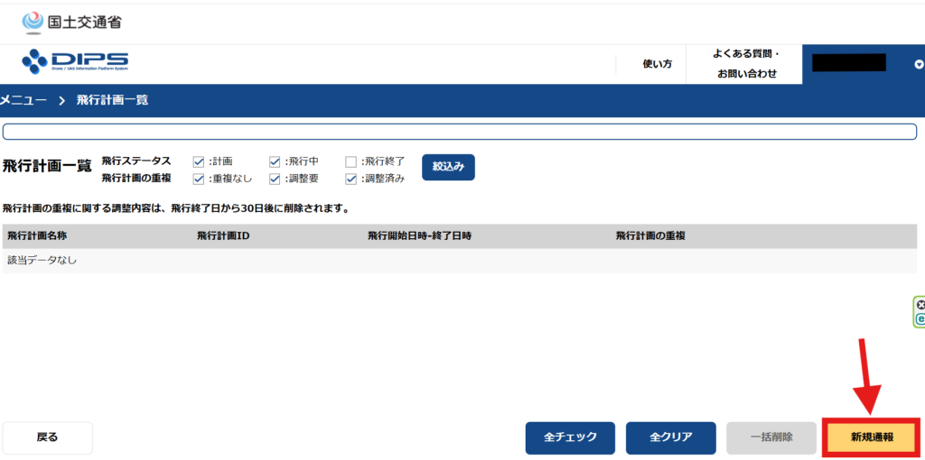 飛ばす機体と場所が決まったら、国土交通省のDIPSにて飛行計画の通報を行います。