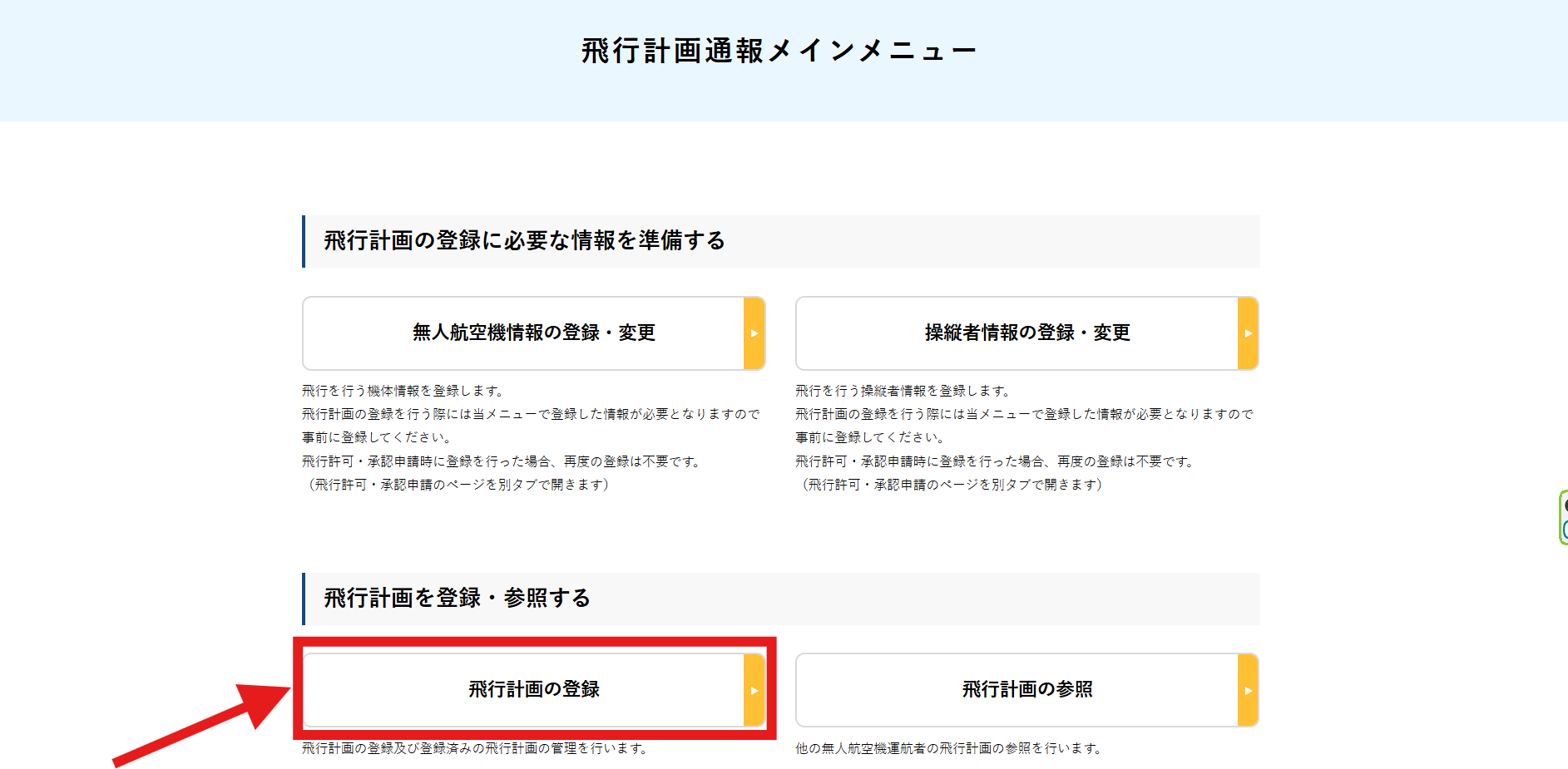 次に[飛行計画の登録]をクリックします。