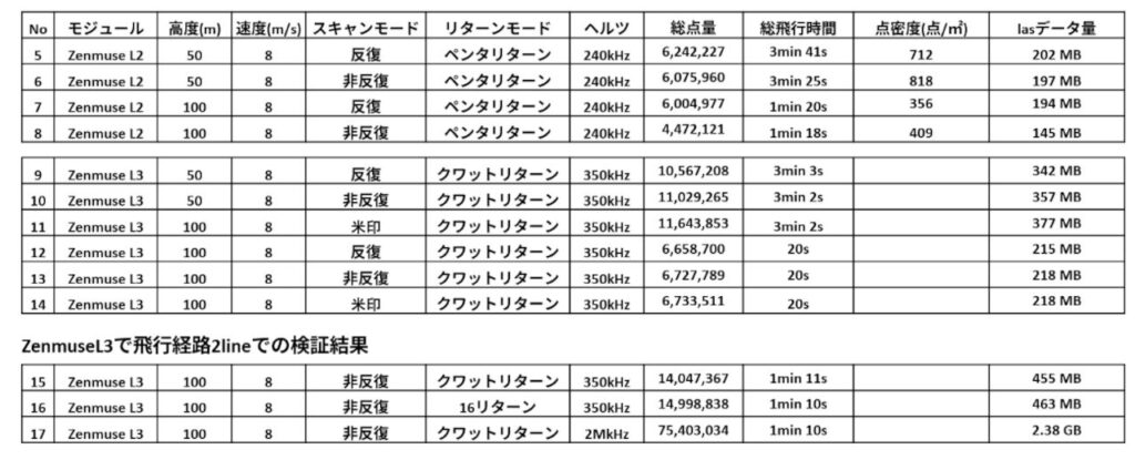 Zenmuse L2(飛行ルート5Line)/L3(飛行ルート3Line)飛行時のフライト時間/計測ルート作成時の点密度を比較