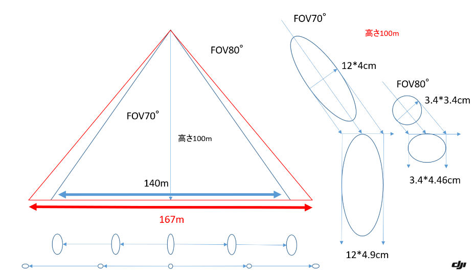 Zenmuse L3 はビーム発散角が 0.26mrad×0.26mrad と小さくなり、形も円状に固定となりました。Zenmuse L2 のビーム発散角は 0.4mrad×1.2mrad で、高度100mだと Zenmuse L2 が 40㎜×120㎜ のところ、Zenmuse L3は 26㎜ と約1/4.6となりました。そのため細かくレーザーを当てることができるため、再現性も格段に向上しております。またビームスポットも円形になったことにより、前作の楕円形に対し歪みづらくなったことも特徴です。