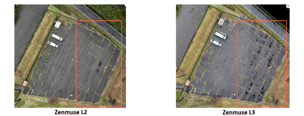 Zenmuse L2/L3 非反復 50m比較(アスファルト赤枠/雨水 5∼15mmほど)