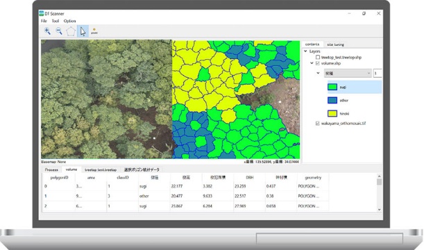 ドローンで撮影したデータから、CHM計算、樹頂点の検出、樹冠の分離、ディープラーニングを用いた樹種識別、DBH・材積・炭素蓄積量推定などの各樹木単位での解析を一通り行うことができます。