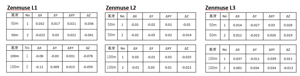 Zenmuse L1/L2/L3 非反復 50m/100mでの精度比較