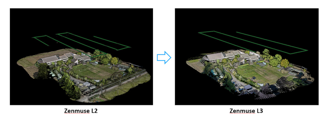 Zenmuse L2よりZenmuse L3の方がLiDARの照射角/可視光のFOVが広くなっているため計測時間を大幅に削減できます。ですが、データ量はLiDARの性能向上と可視光の解像度向上+2眼のため2倍の写真量となり、約2~3倍以上になることがあるので注意が必要です。