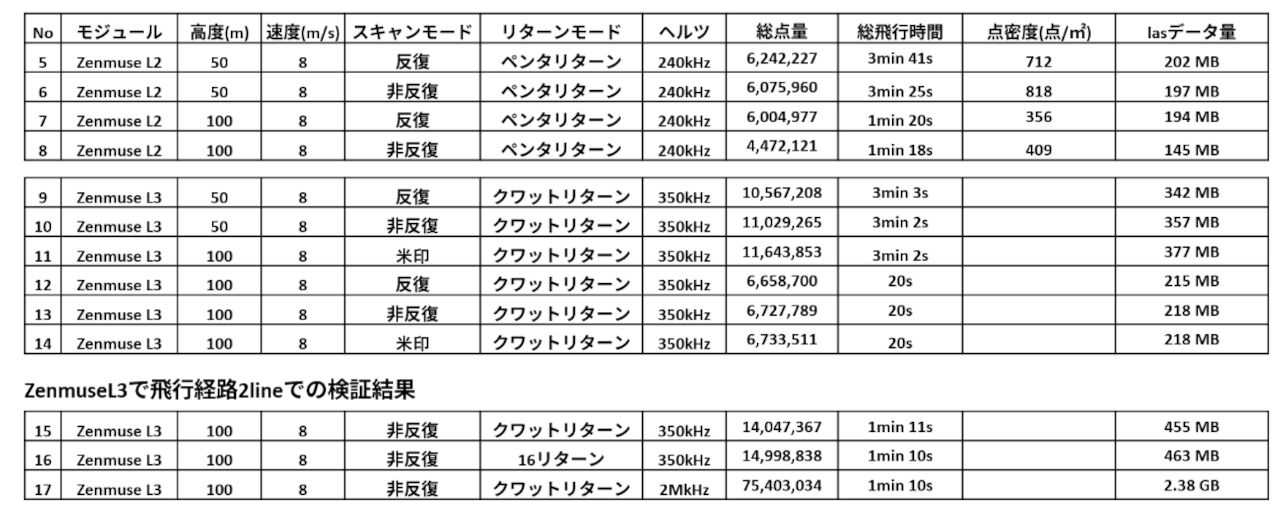 Zenmuse L2(飛行ルート5Line)/L3(飛行ルート3Line)飛行時のフライト時間/計測ルート作成時の点密度を比較