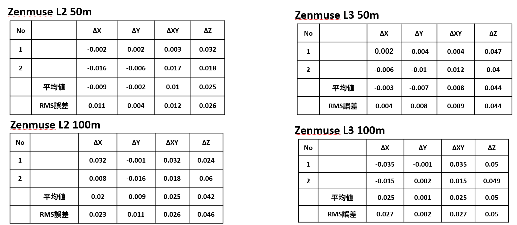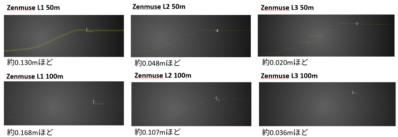 Zenmuse L1/L2/L3 非反復 50m/100mでの精度比較