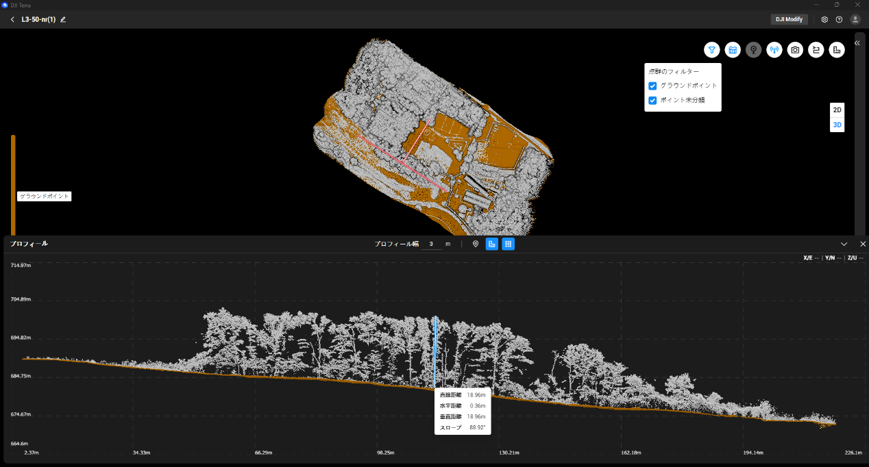DJI Terra にて断面表示/計測が可能