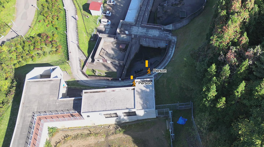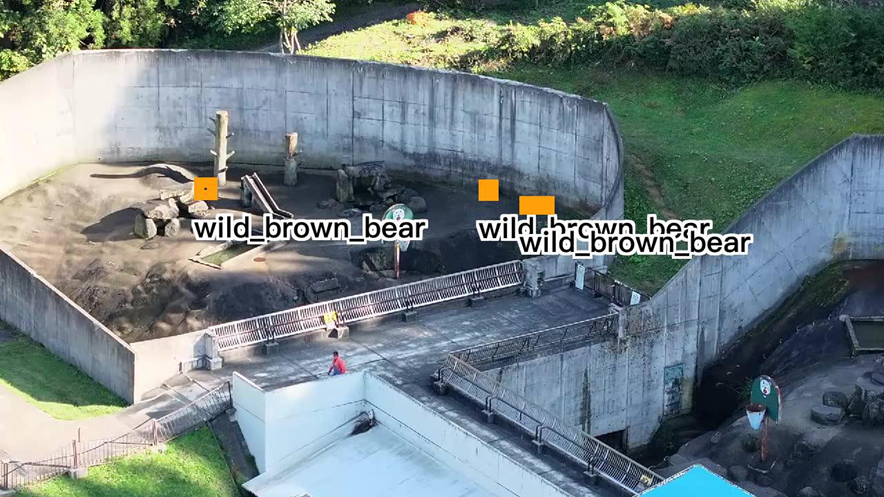 下は実際に検証した画像です。上空から熊の動きをリアルタイムで捉え、自動的に熊を検出する性能を確認することができました。また、木陰など一部視界が遮られる状況でも検知が可能でした。