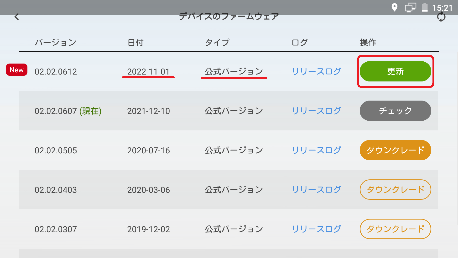 2.デバイスのファームウェアの一覧が出ますので、タイプが公式バージョン」なっている最新日付のバージョンの「更新」を選択します