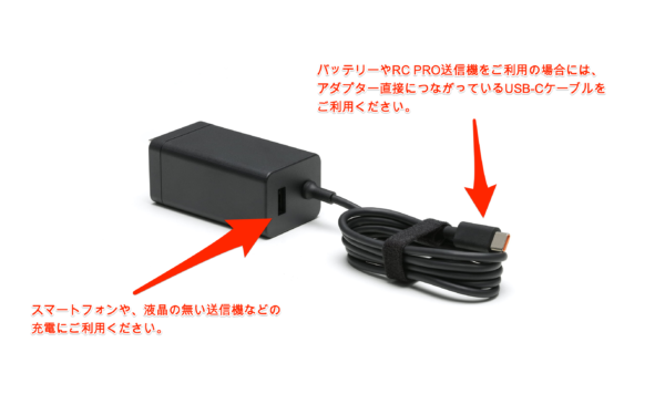 空き端子になっているUSB-A端子からの充電は、上記のバッテリーや RC PRO の充電には非推奨で、充電時間が非常に長く掛かりますので、ご注意ください。