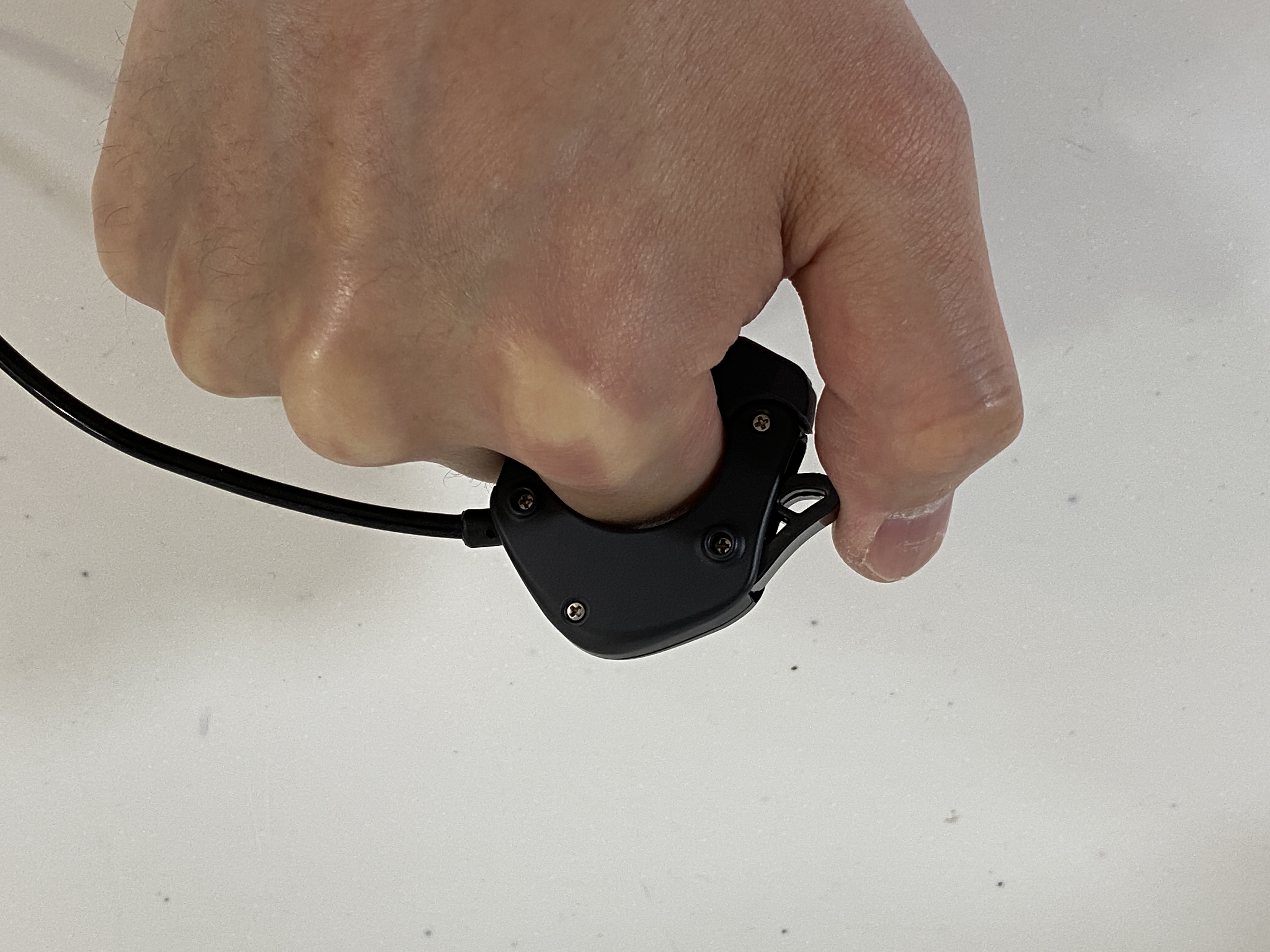 以下の様に人差し指人に装着して、親指でスイッチ操作をする様に設計させております。ご参考ください。