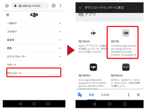 【左上の三】をタップ→【ダウンロード】をタップ→【DJI Fly】をタップ