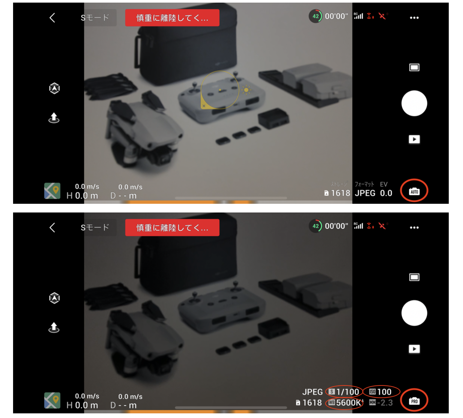 設定変更は、右下のカメラマークをクリックいただくことで「オート(AUTO)」と「マニュアル(PRO)」とを切り替え可能となります。