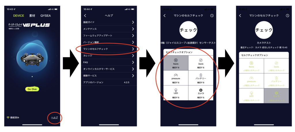 QYSEA FIFISH Vシリーズ アプリからのマシンセルフチェック手順を知りたい
