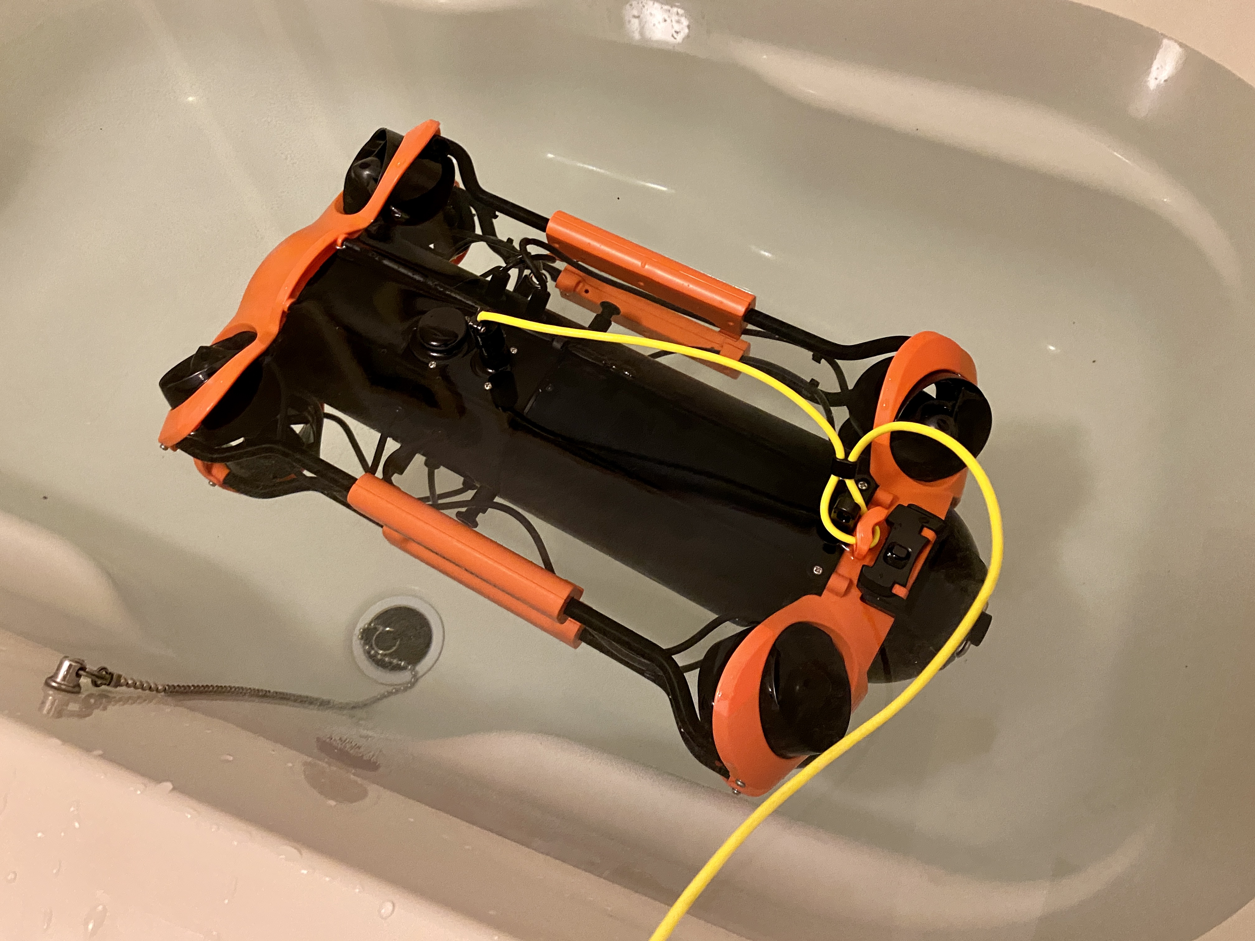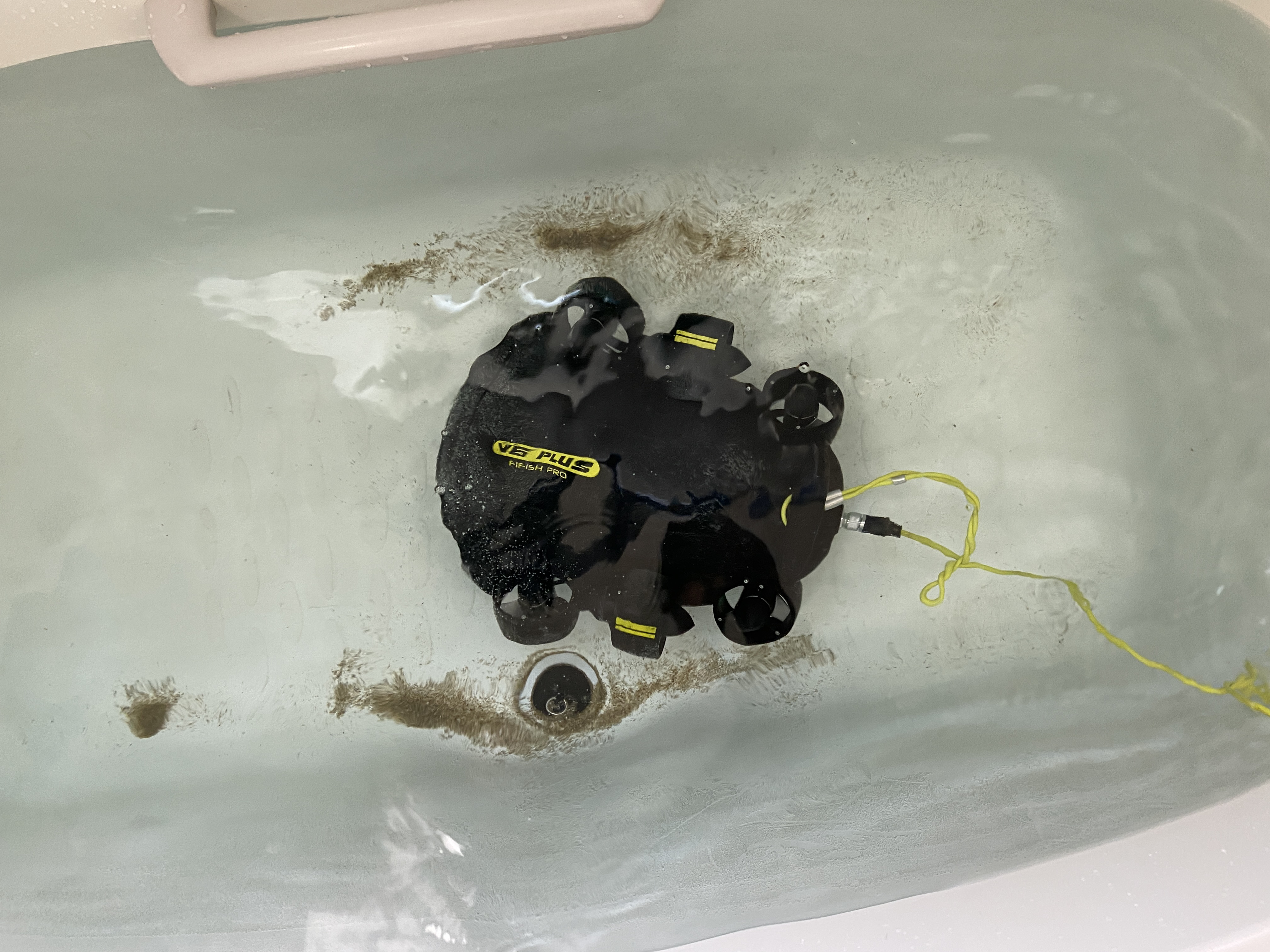 水中では壁面などへの衝突にご注意ください。機体を衝突させた場合は、破損の原因となりますのでご注意ください(ボディーの傷・破損・LED破損・カメラ破損・メインユニット破損等)