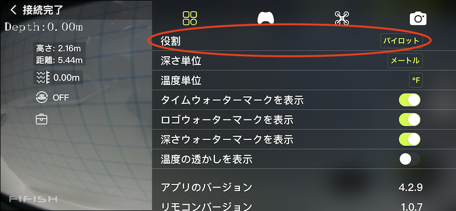 2.別途FIFISHアプリをインストールした携帯端末も(1.)同様にコントローラーとWi-Fi接続をしてFIFISHアプリを起動いただくと接続が完了します。