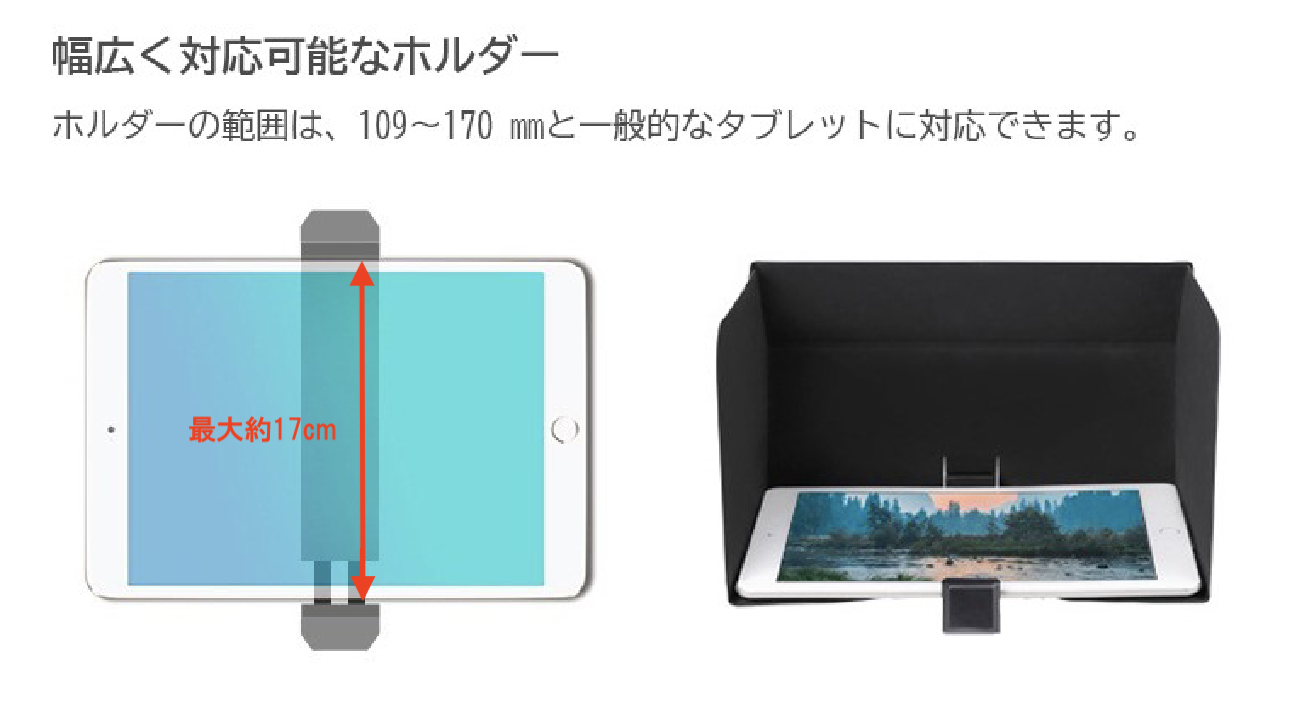(約10.9cm ~ 約17cmまでのタブレットを設置可能です。)