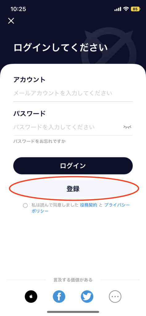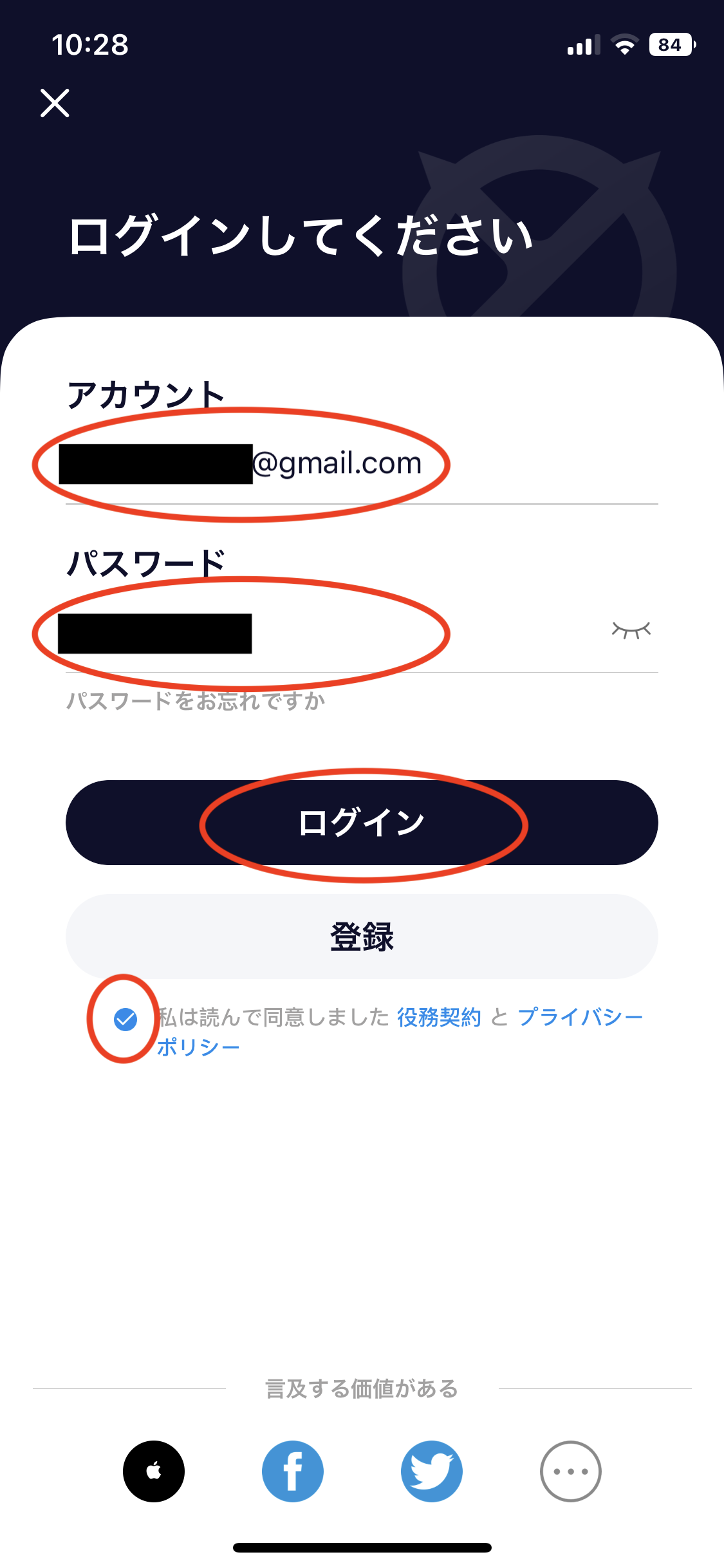 6.登録した「メールアドレス」と「パスワード」を入力して、契約事項とプライバシーポリシーをご確認いただき、同意の場合は「チェック」をして、「ログイン」をクリック