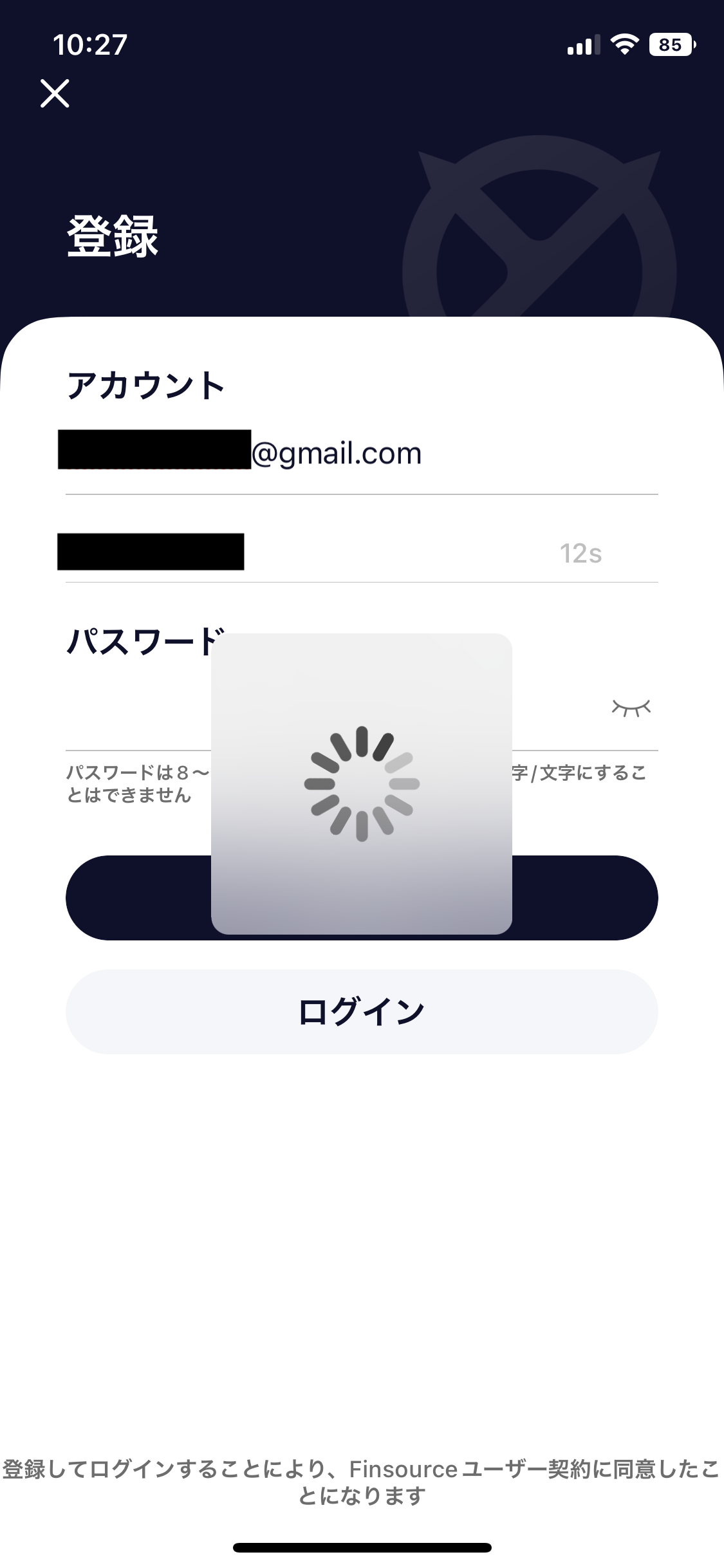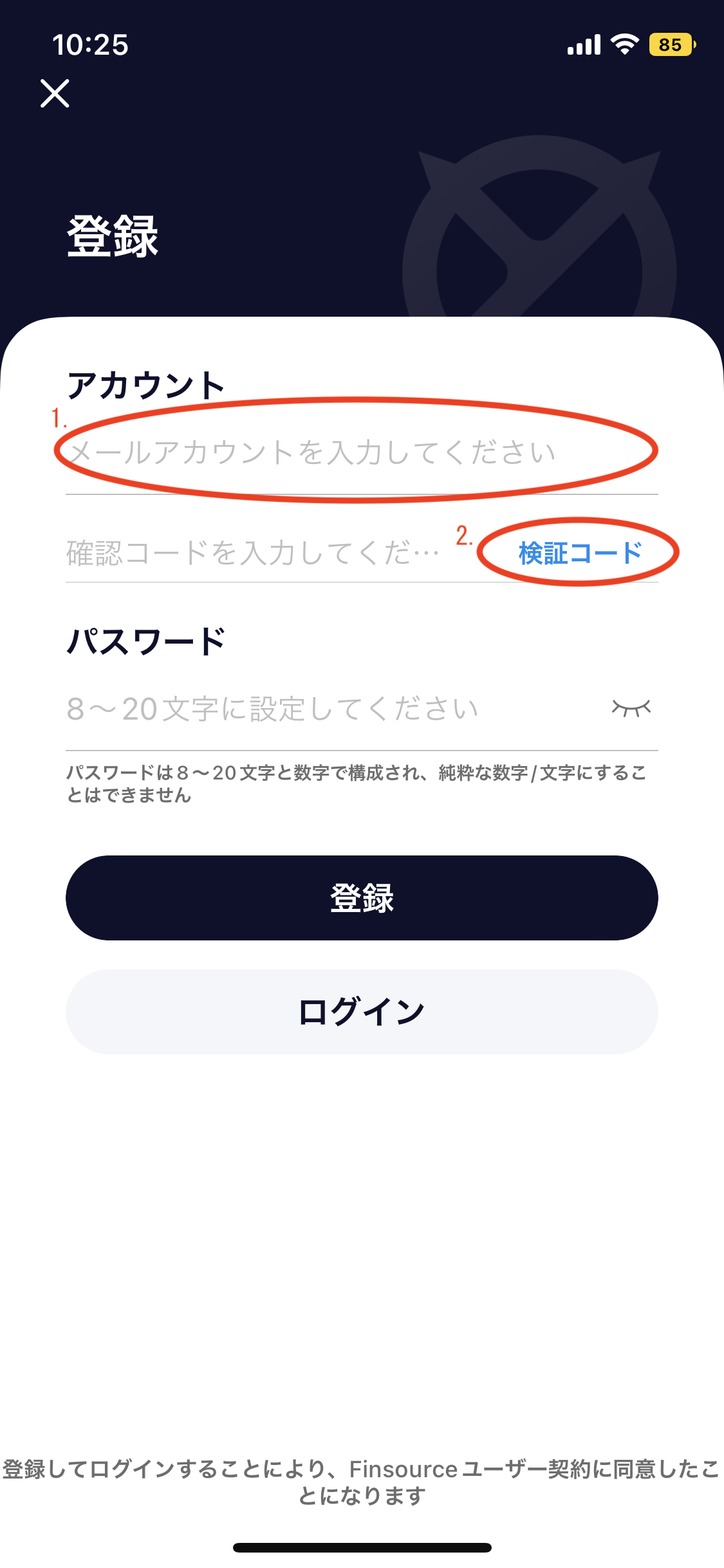 5.メールを確認の上、「検証コード」と任意の「パスワード」を入力して登録を進めます。完了後に「ログイン」をクリック