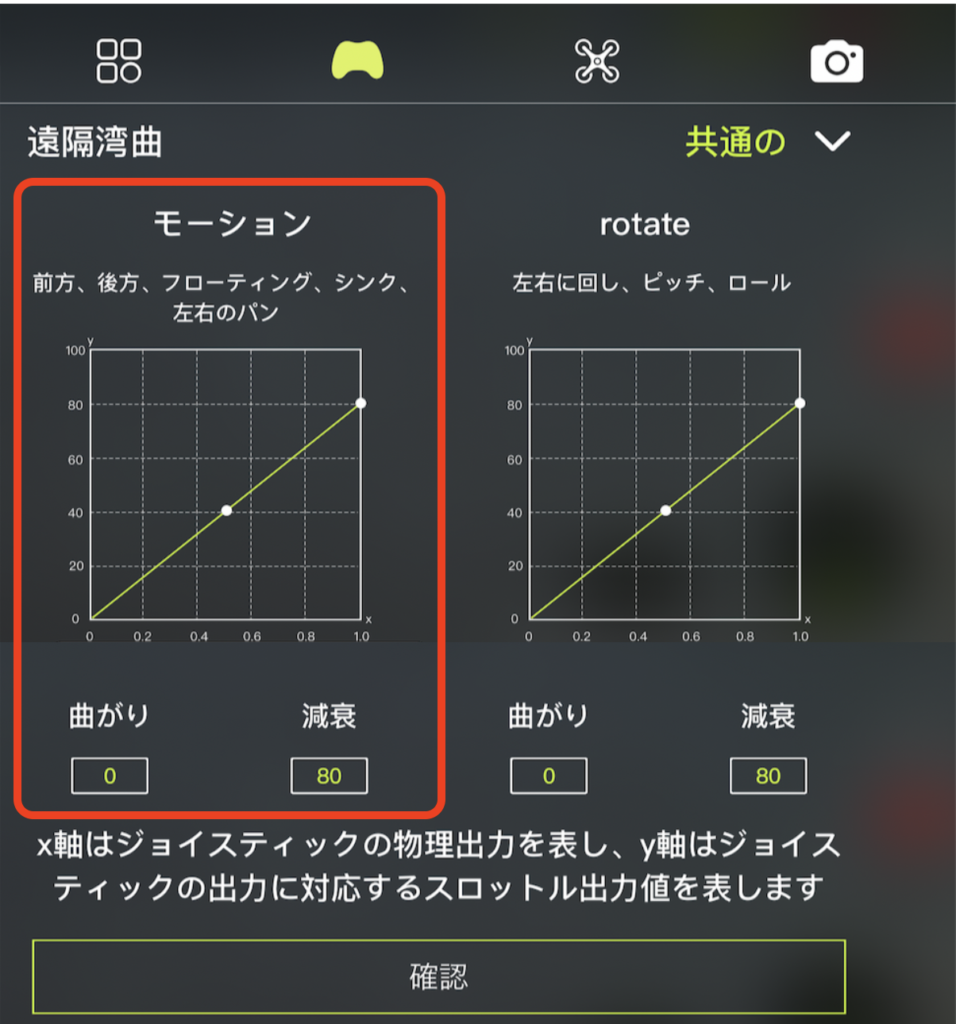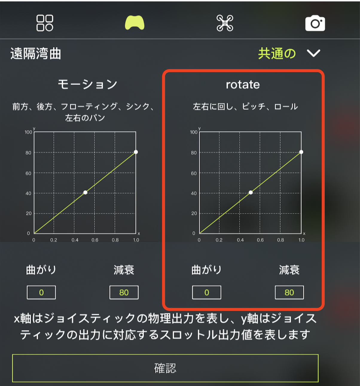 遠隔湾曲設定は、スロットルスティック感度(操作感度)を可能な範囲で好みで設定するスロットルカスタム機能です。