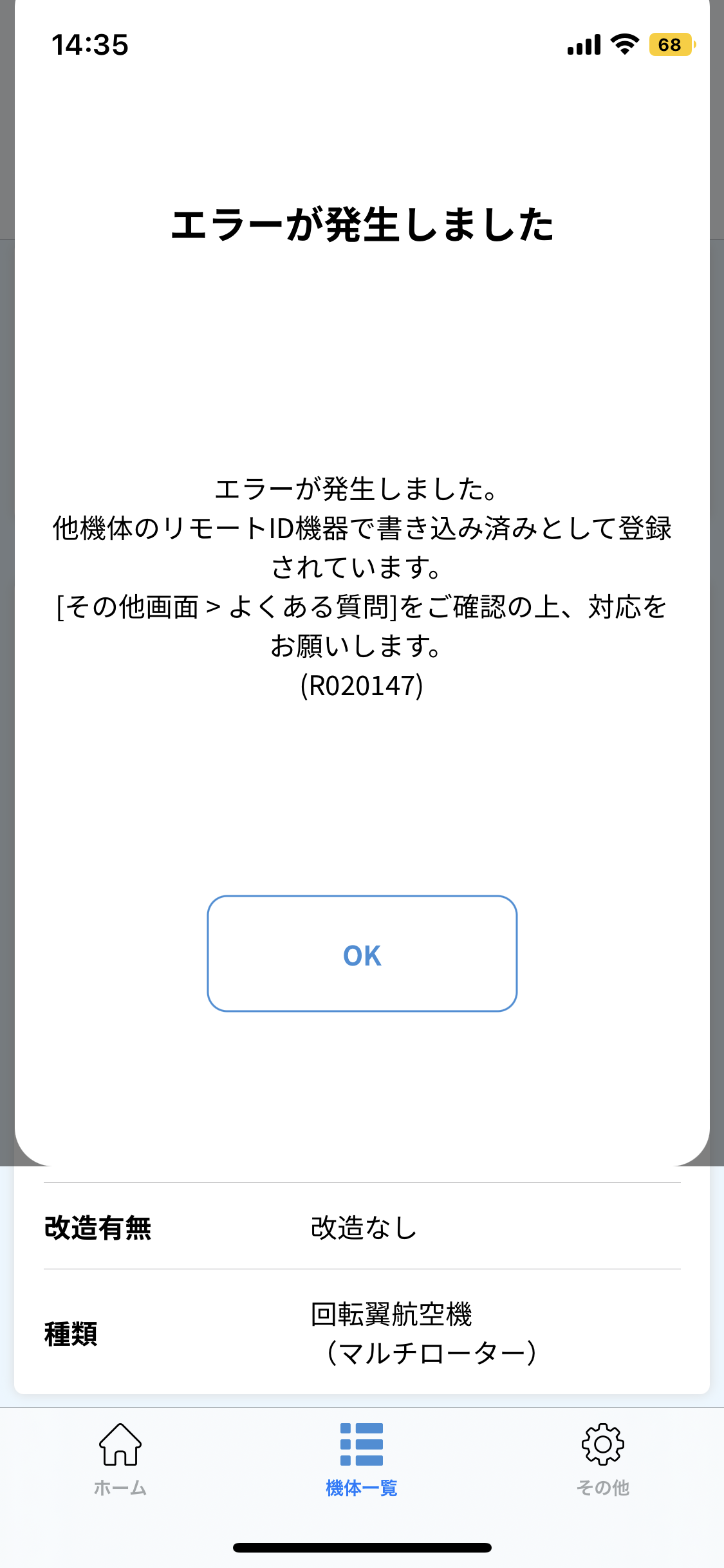 エラーの表記通り、他の機体で該当のAERO-Dの製造番号にてリモートID情報が書き込み済みとなっており、重複登録での登録を防いでいる状況です。