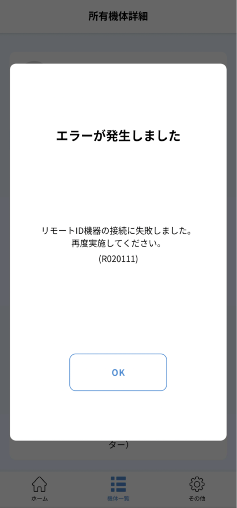 DIPS APPより「リモートID書込」を行い「接続可能機体一覧」正常に該当のAERO-Dの製造番号が表示され、そのまま手続きを進行し書込をはじめると「エラーが発生しました。リモートIDの書き込みに失敗しました。再度実施してください。」という案内が表示され、情報書き込みができない場合がございます。