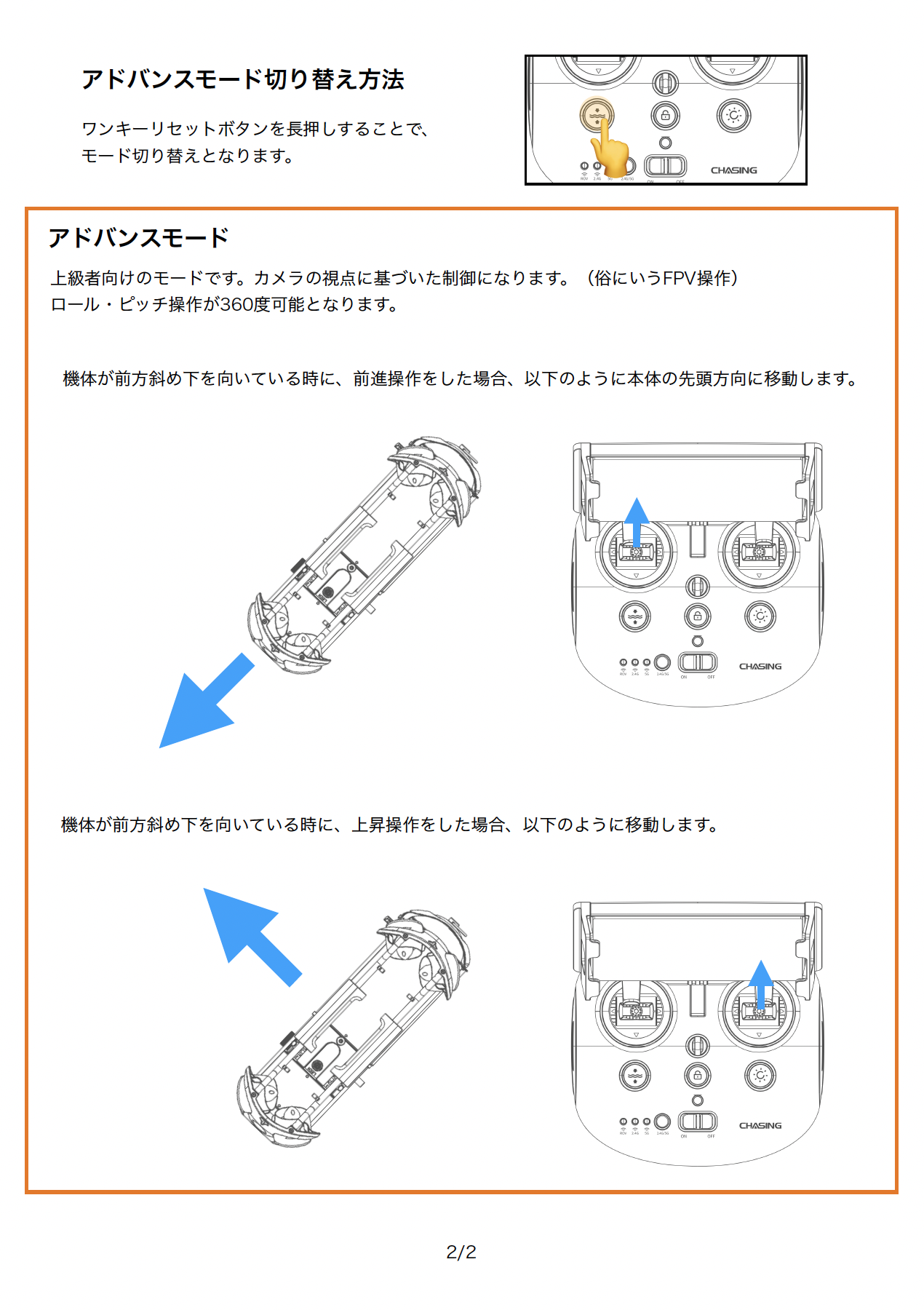 CHASING M2 シリーズ 操縦モード別 スティック操作による機体移動について CHASING M2 シリーズには操作モードが2種類あります。 ベーシックモード アドバンスモード 各モードについては以下をご確認ください。 ※当記事の無断での複製、改編、転載、二次利用などは一切禁じます。 ※記載内容は公開時点での仕様に基づいています。バージョンアップなどにより記載内容と異なる場合があります。 ※記載事項は予告なく変更となる場合があります。 CHASING Q&Aの一覧に戻る SHARE POST LINEで送る DJI PGYTECH HOBBYWING AERO-D外付型リモートID CHASING QYSEA SUBLUE WAYDOO Unitreeユニツリー FJDynamics SAVOX SUNPADOW Firmware Updateファームウェア OTHERSその他 Q&A / 技術的なご質問 内検索: