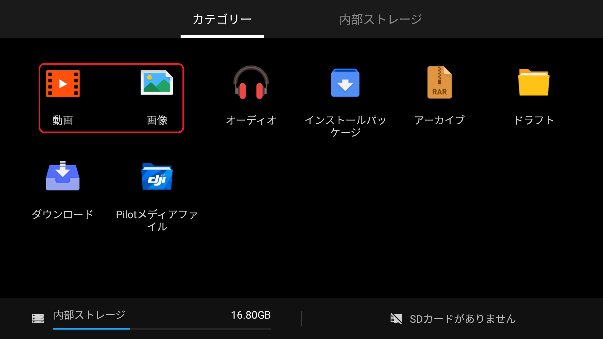 6.送信機にSDカードが挿入されている場合は、画面に表示されますので、「SDカード」をタップします