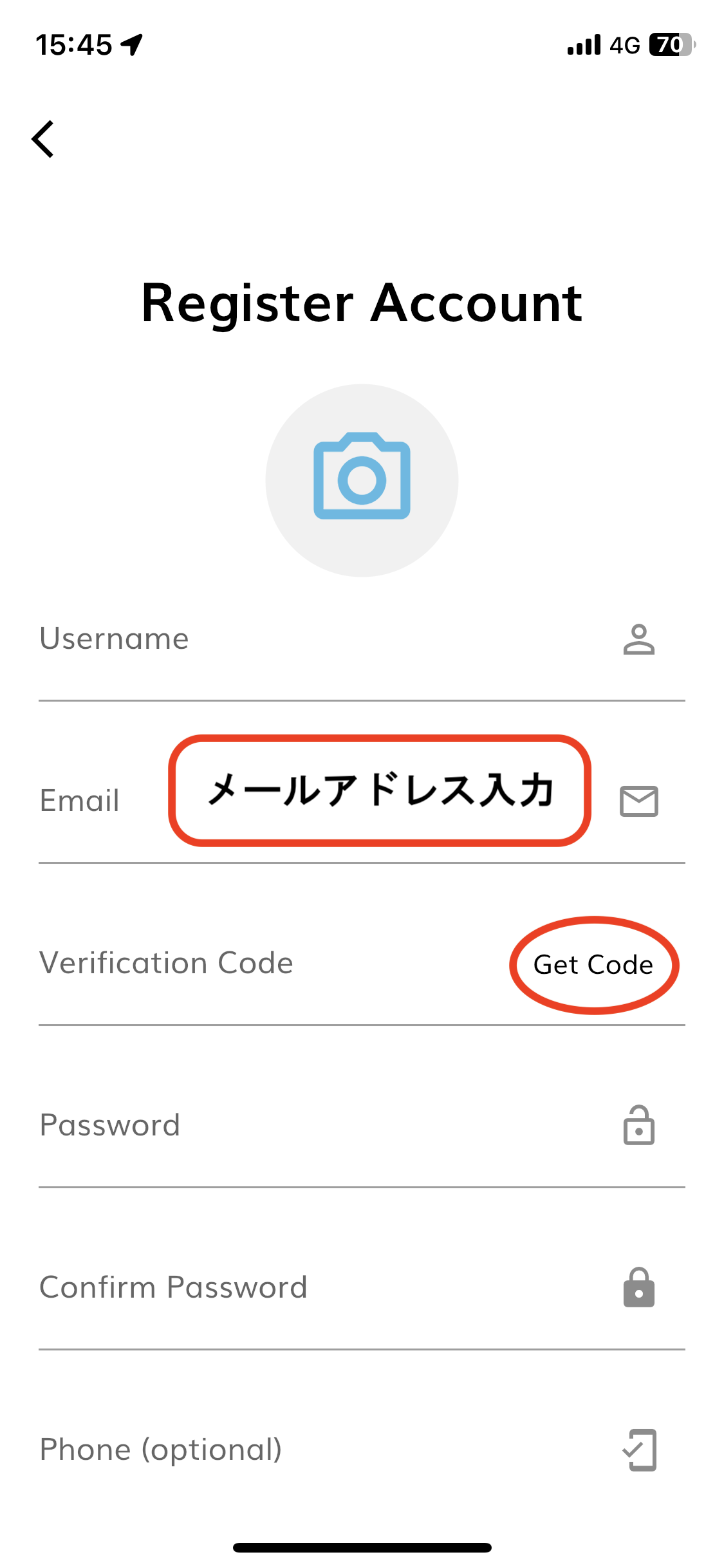 3.Register Account にて「Email」を入力して、「Get Code」をクリック