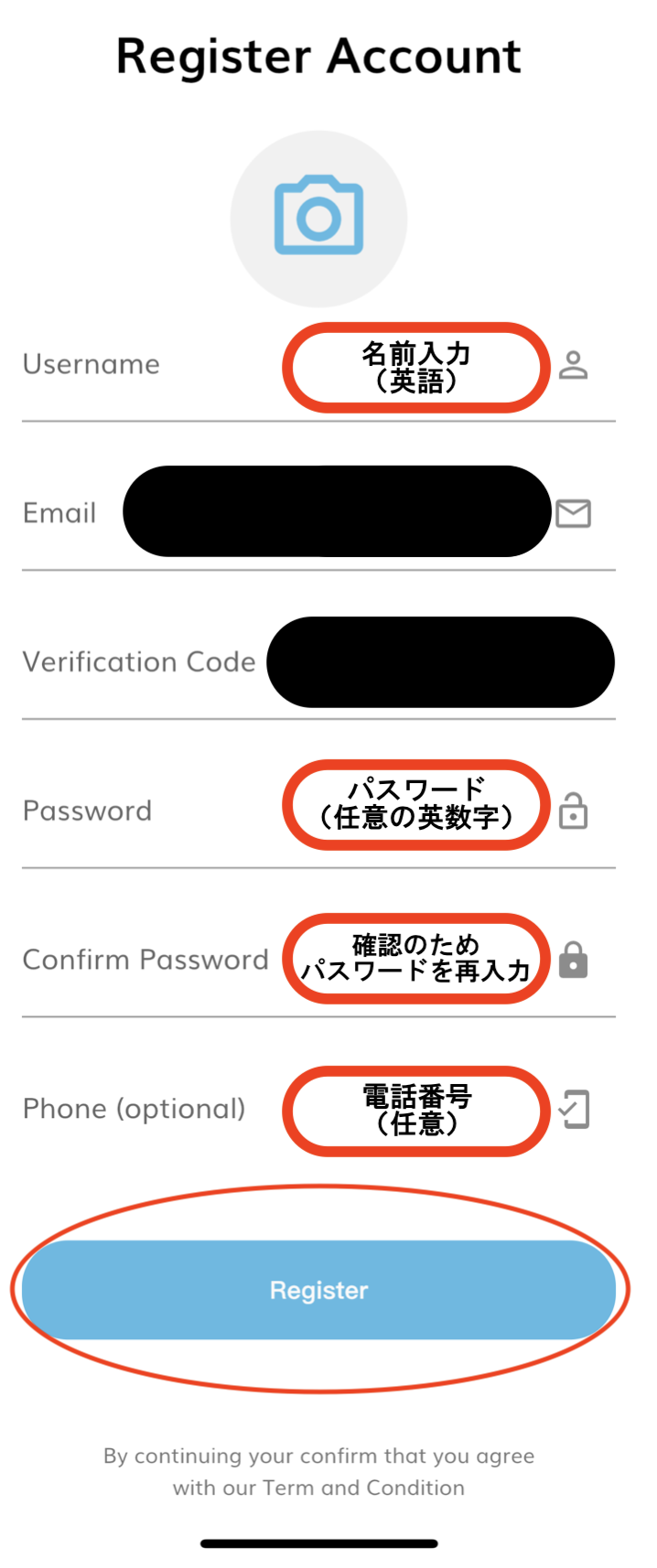 5.「Username」「Password(任意の英数字)」「Confirm Password(Passwordで入力したのと同じもの)」「Phone(optional)」(入力は任意))を入力して「Register」をクリック