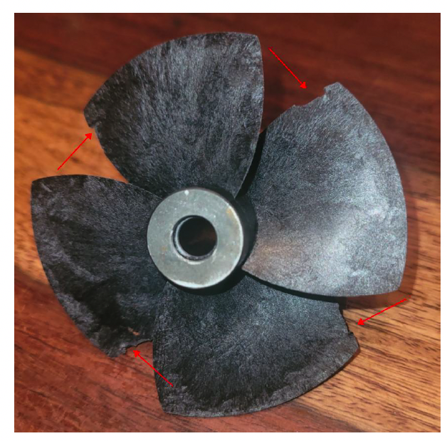 水中のゴミ、特に硬いもの(砂利など)が巻き込まれると、高速回転するプロペラが以下の写真のように損傷・劣化します。