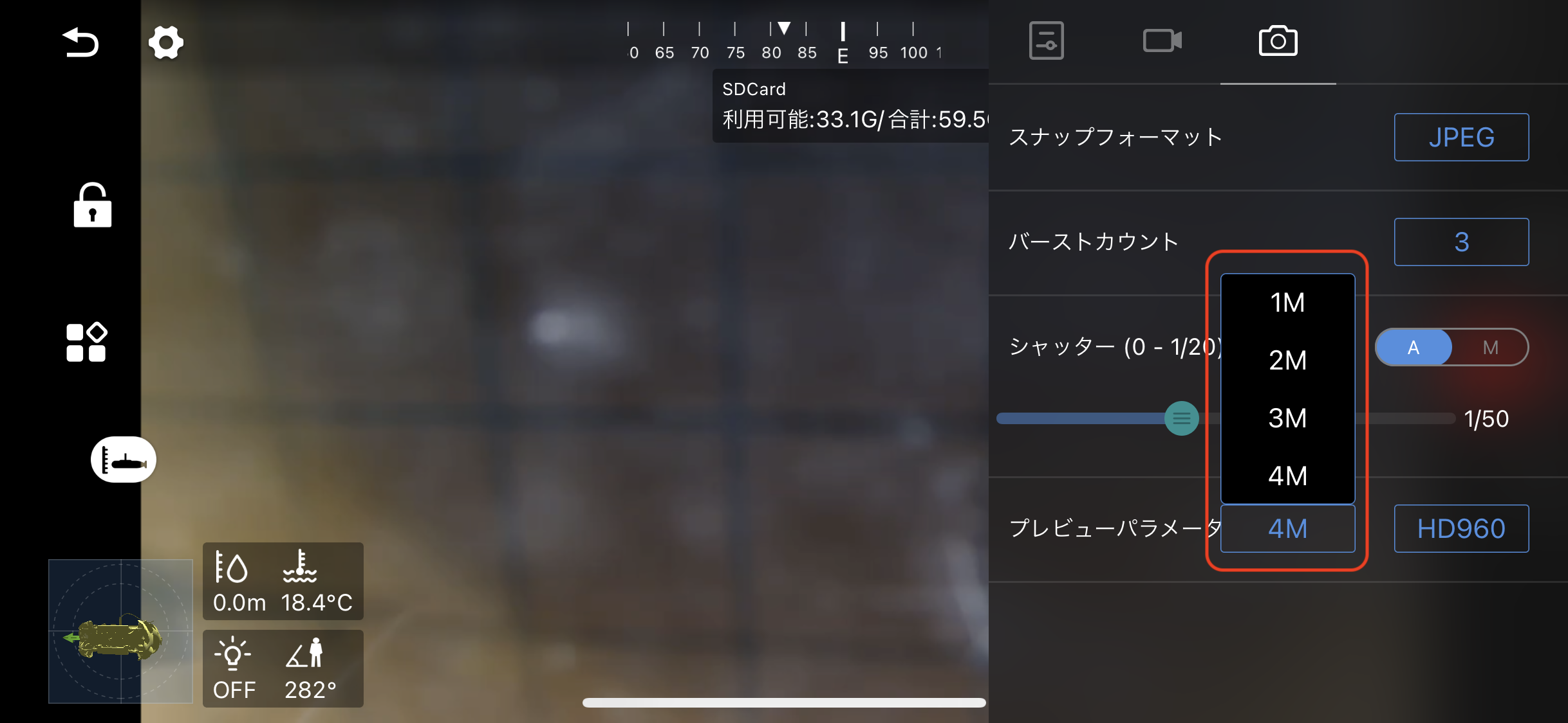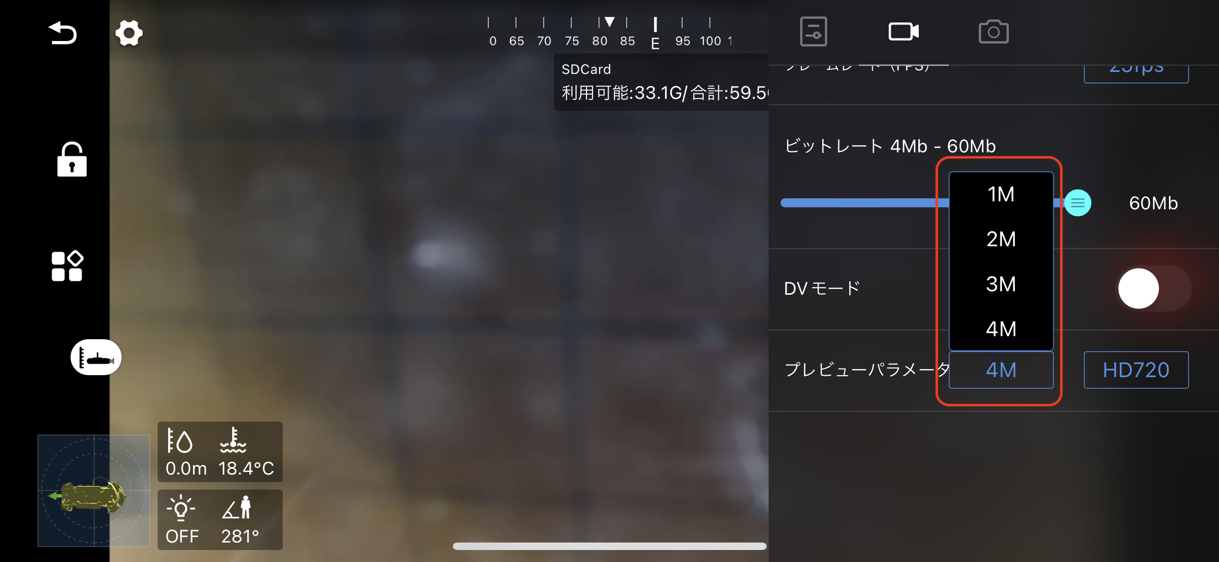 動画撮影モード時、静止画撮影モード毎に設定があり、1M〜4Mの間で設定が可能となり、数値が上がるごとに画質が上がります。