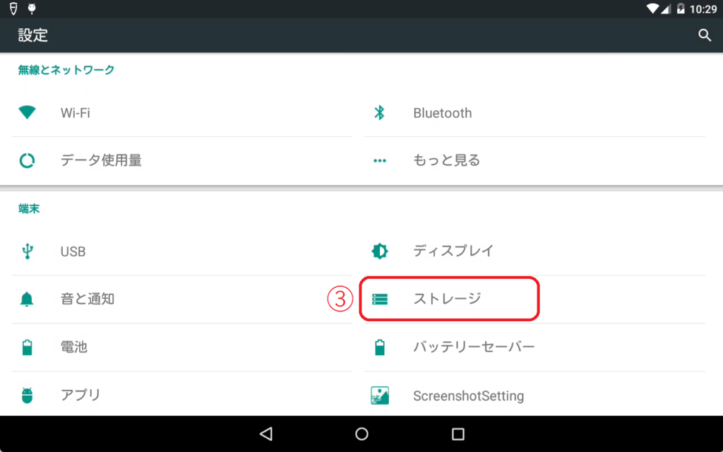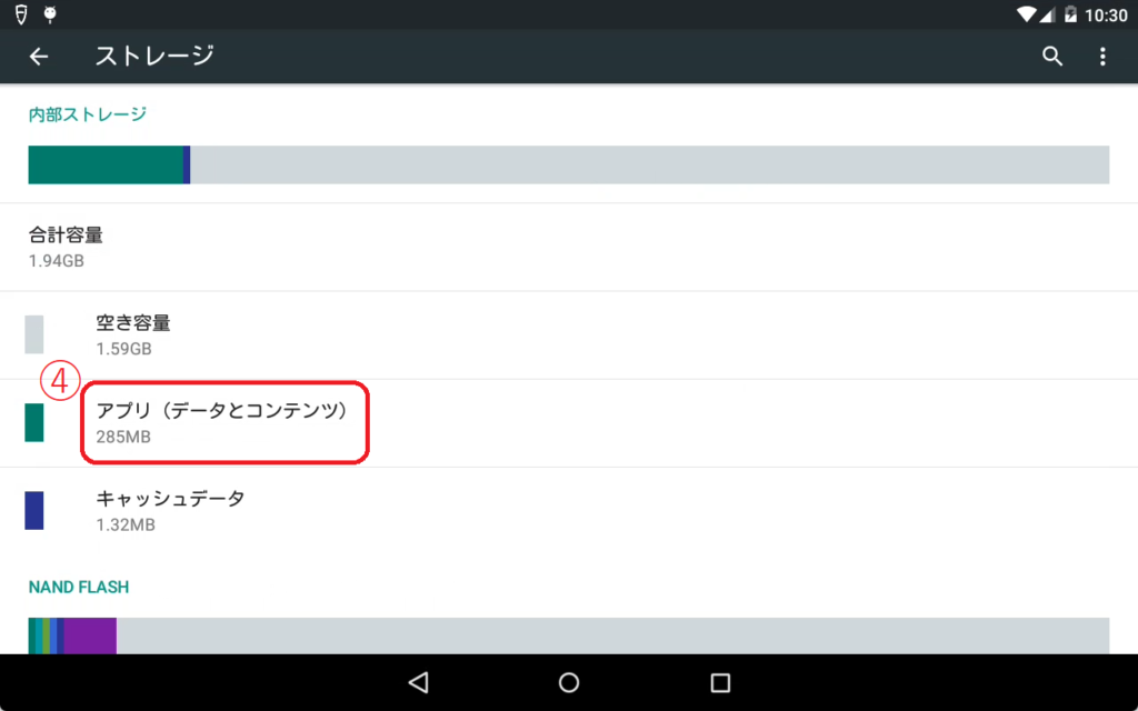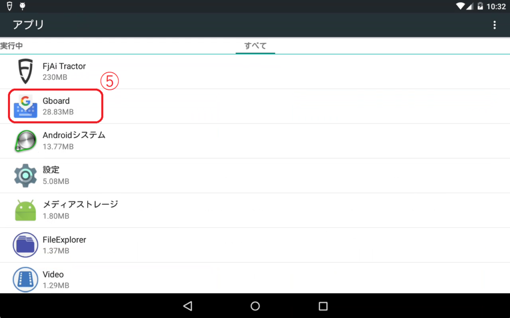 ③ストレージ > ④アプリ(データとコンテンツ) > ⑤Gboardとタッチして進みます