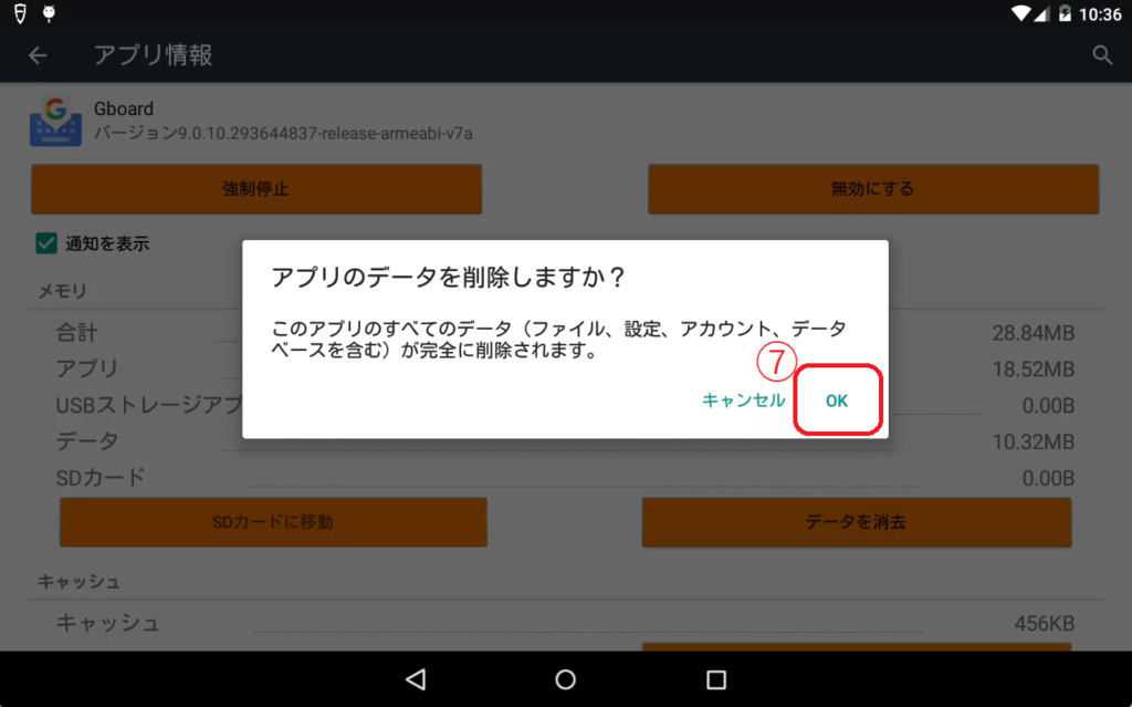 ⑥データを消去をタッチし > ⑦確認画面が表示されたらOKをタッチします