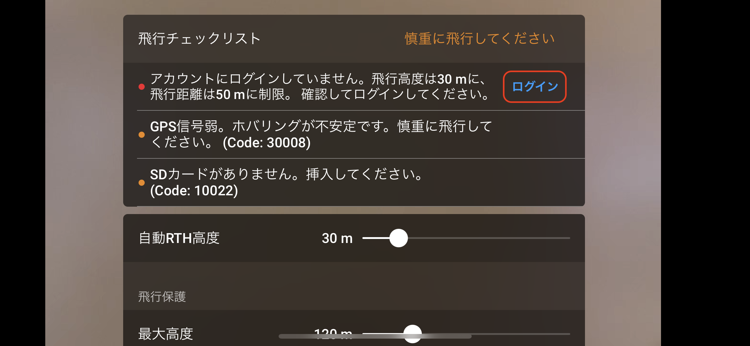 アカウントにログインしない状態でのご利用については、利用制限(飛行高度・飛行距離制限)が発生いたします。