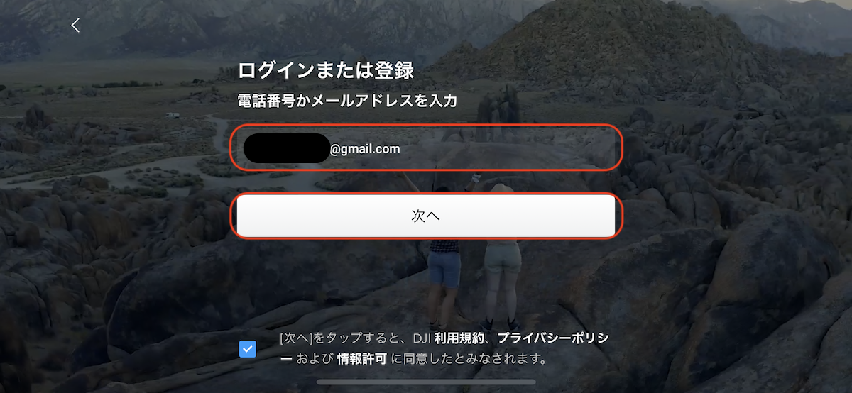 3.作成済みのDJIアカウントのメールアドレスを入力し。「次へ」をクリック