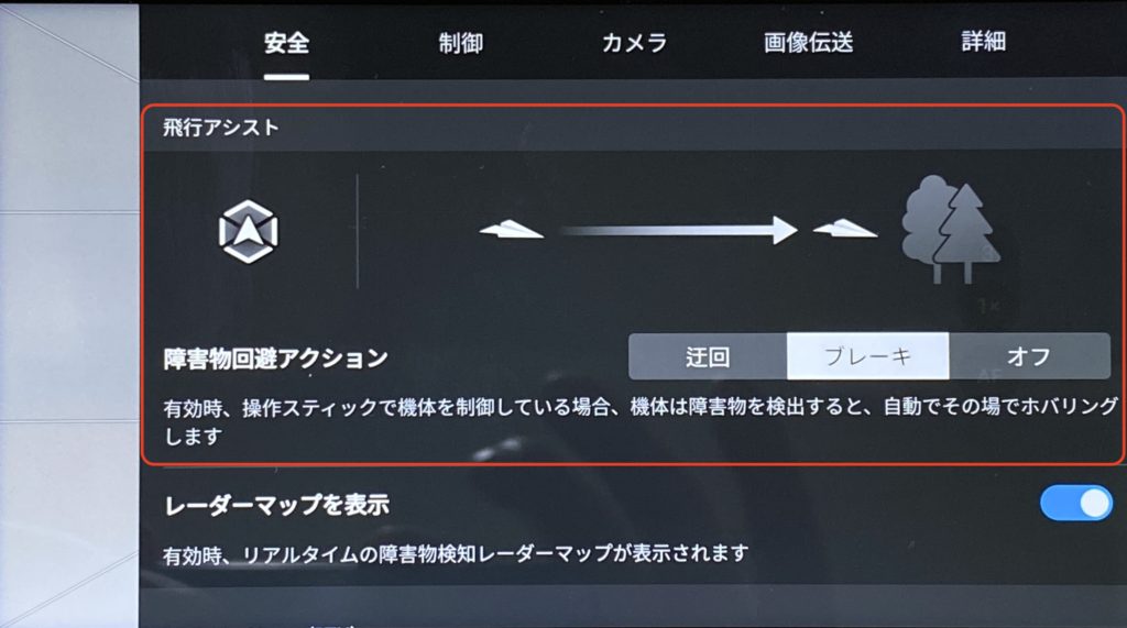 なお、上記の方法で改善がない場合は、飛行アシスト(APAS)内で障害物回避アクションがオン(ブレーキor迂回)の状態かをご確認ください。