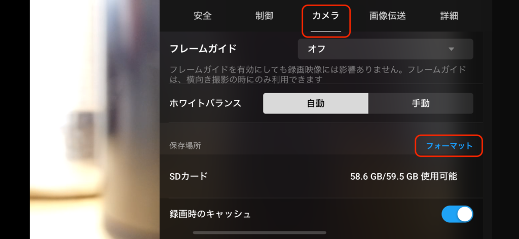 2.「カメラ」を選択して「フォーマット」をクリック