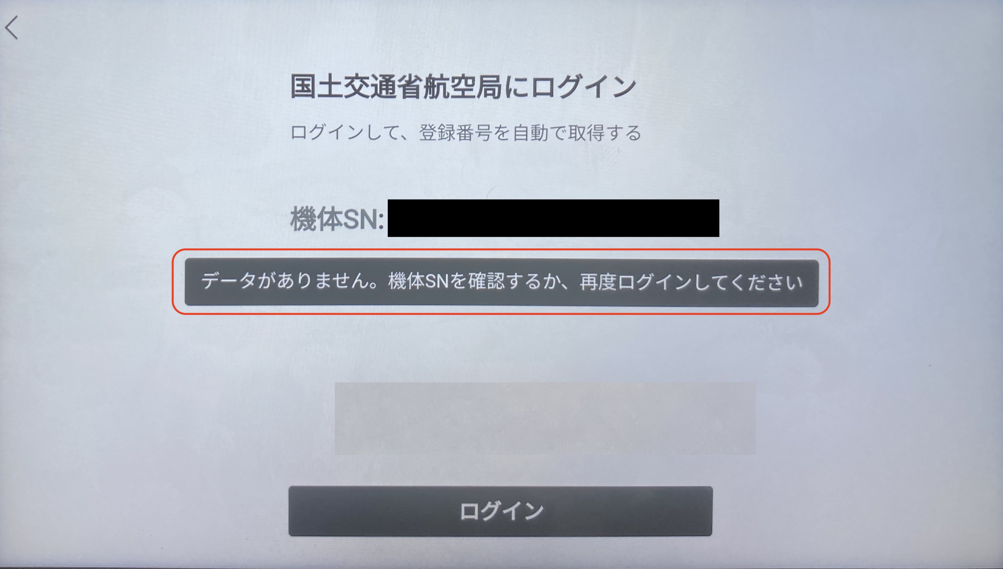 リモートID登録時に「データがありません。機体SNを確認するか、再度ログインしてください」と表示されて紐付け設定ができません。