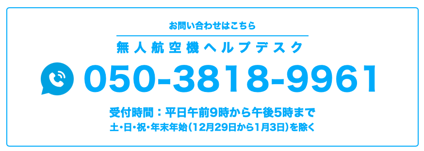 上記で解決しない場合、リモートIDや機体登録など、ドローン登録システムでの手続きに関するご質問は、無人航空機登録ヘルプデスクへご質問ください。