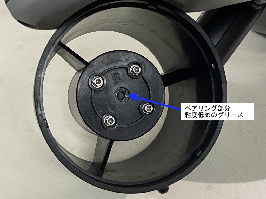 ※グリスの塗り過ぎには注意してください。塗りすぎるとかえってベアイングの回転不良が起こしたり、水中の浮遊物や砂などが付着しやすくなったりして動作不具合が出る場合があります。